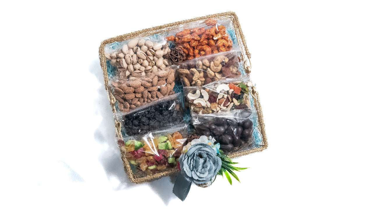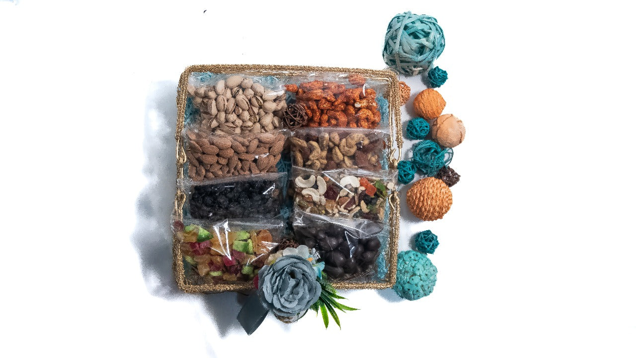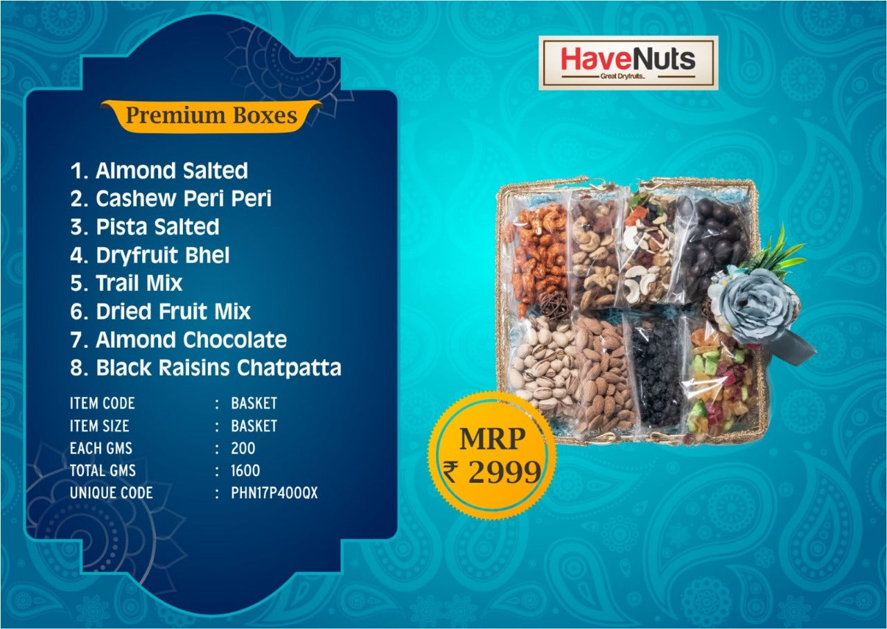 Indulge in the luxurious blend of flavors with the Havenuts Royal Delight Gift Hamper, a premium assortment of 8 exquisite dry fruits and chocolates, carefully packed in an elegant gift basket. Perfect for festivals, celebrations, and corporate gifting, this hamper is a combination of taste, health, and sophistication.